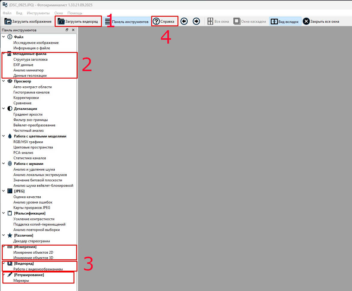 - Отсутствует возможность просмотра и экспорта метаданных изображения (см. изображение 1 метка 2)